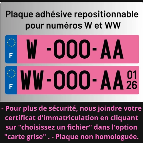 - Pour plus de sécurité, nous joindre votre certificat d'immatriculation en cliquant sur "choisissez un fichier" dans l'option "carte grise" . - Plaque non homologuée.